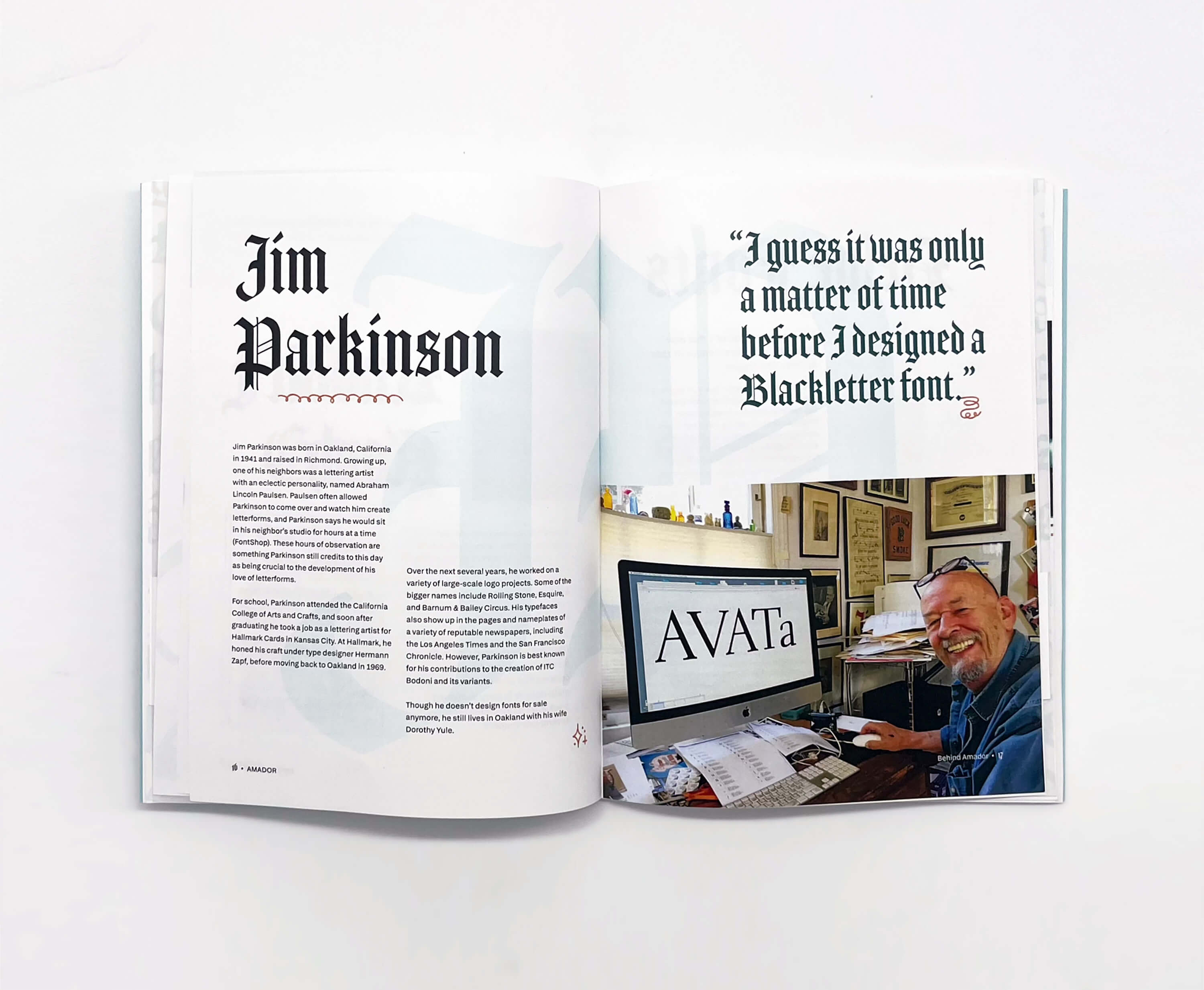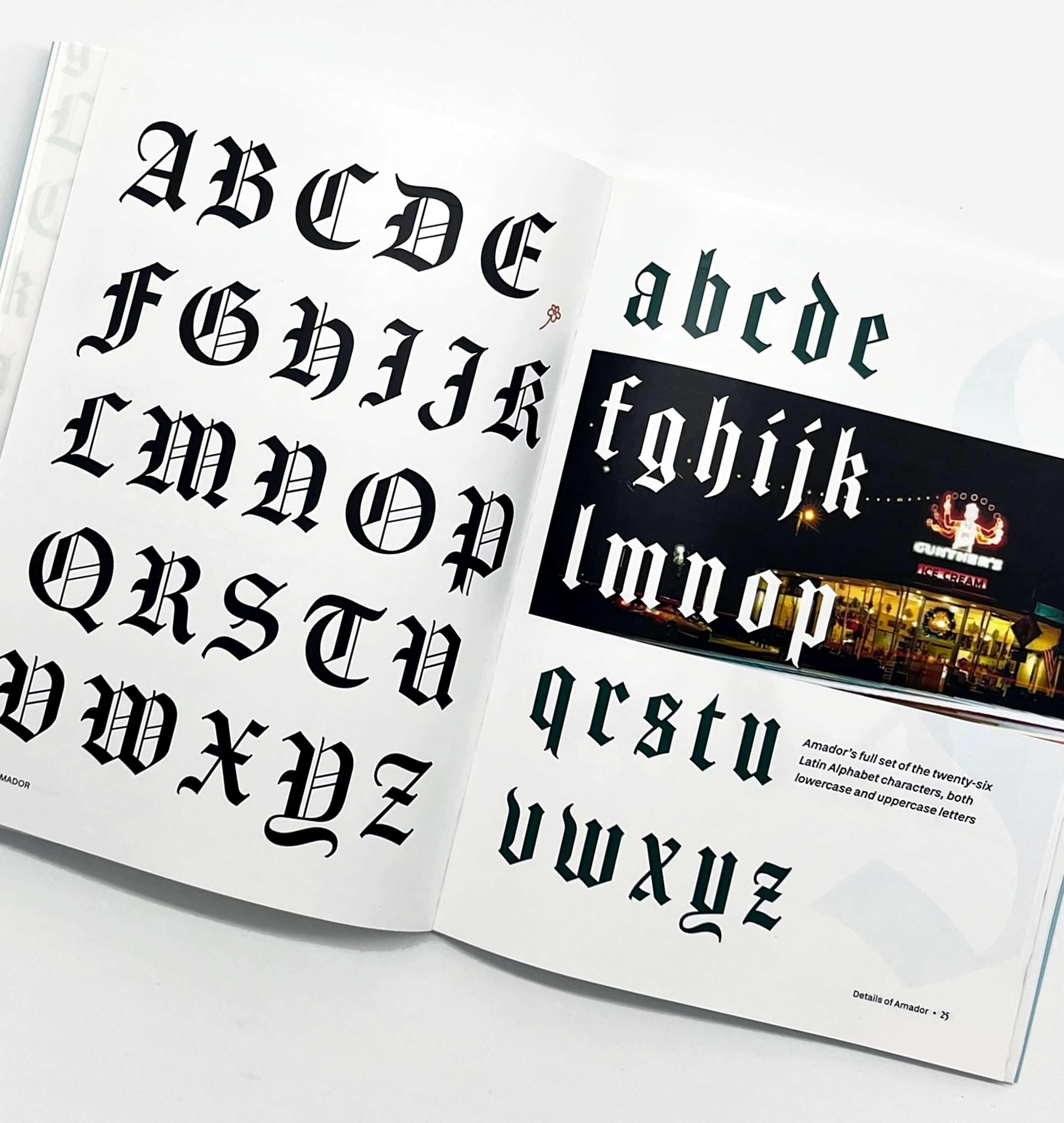 Created by type designer Jim Parkinson, Amador is a blackletter typeface that blends traditional hand lettering techniques with what he describes as a “modern Californian influence.” I was initially drawn to blackletter typefaces for their decorative qualities, and quickly fell in love with Amador’s structure and elegance.