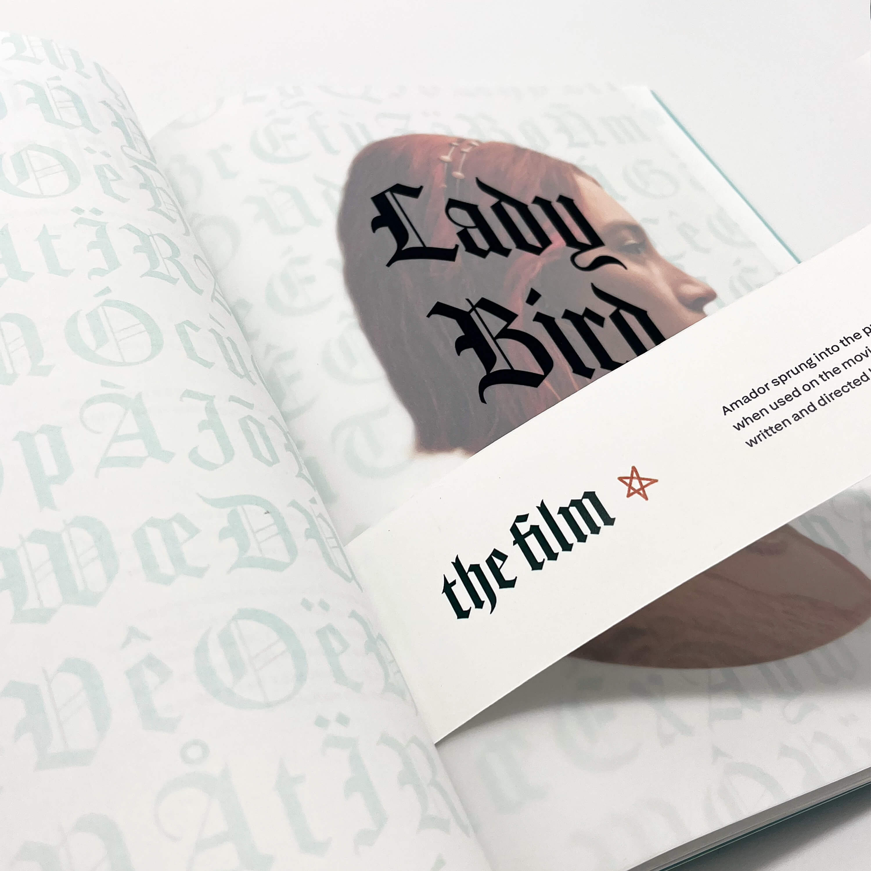 Amador is a 54-page typeface specimen book exploring the font with the same name, including its history, letterforms, and its most well-known application in the 2017 film, Lady Bird.