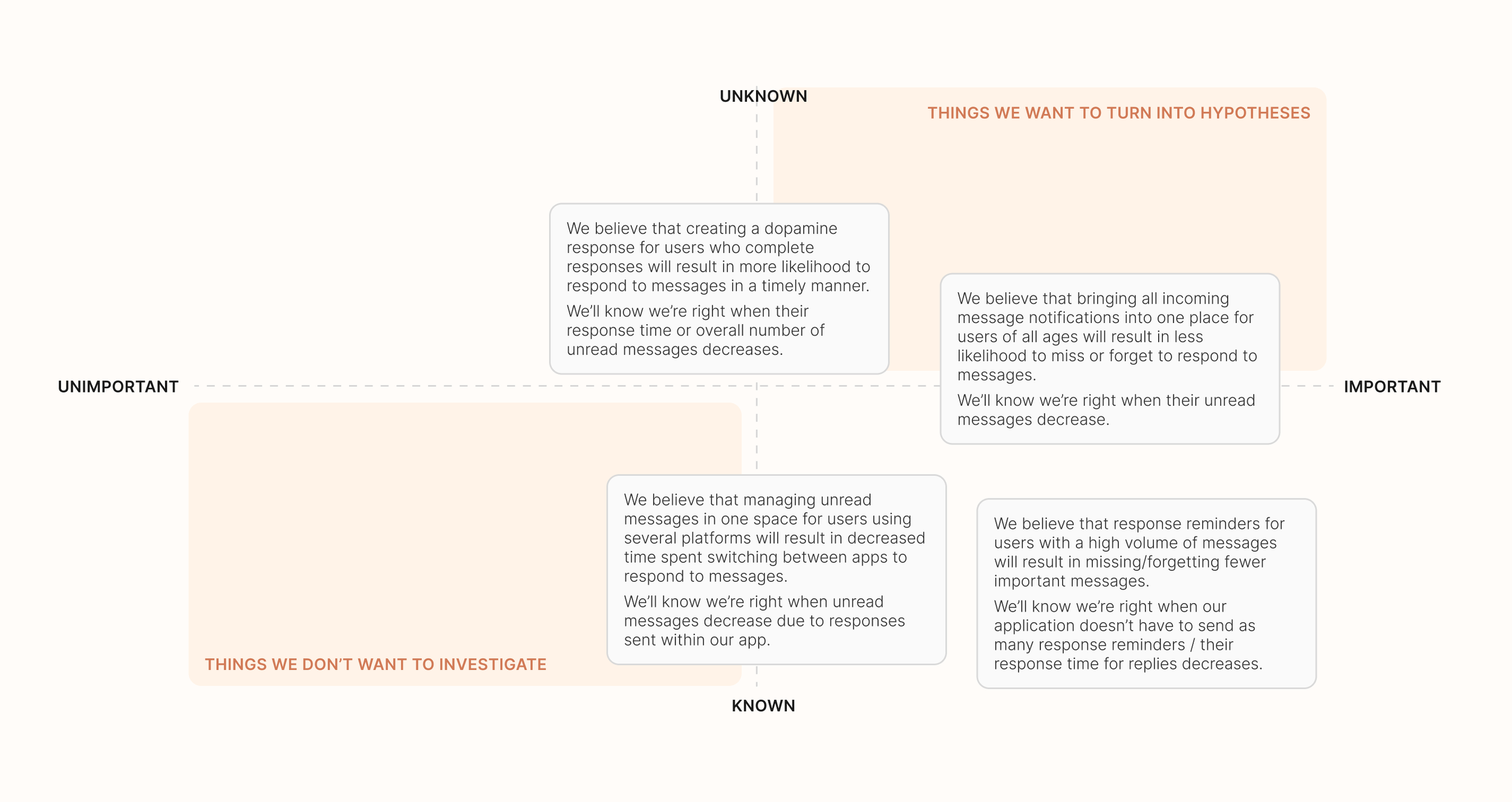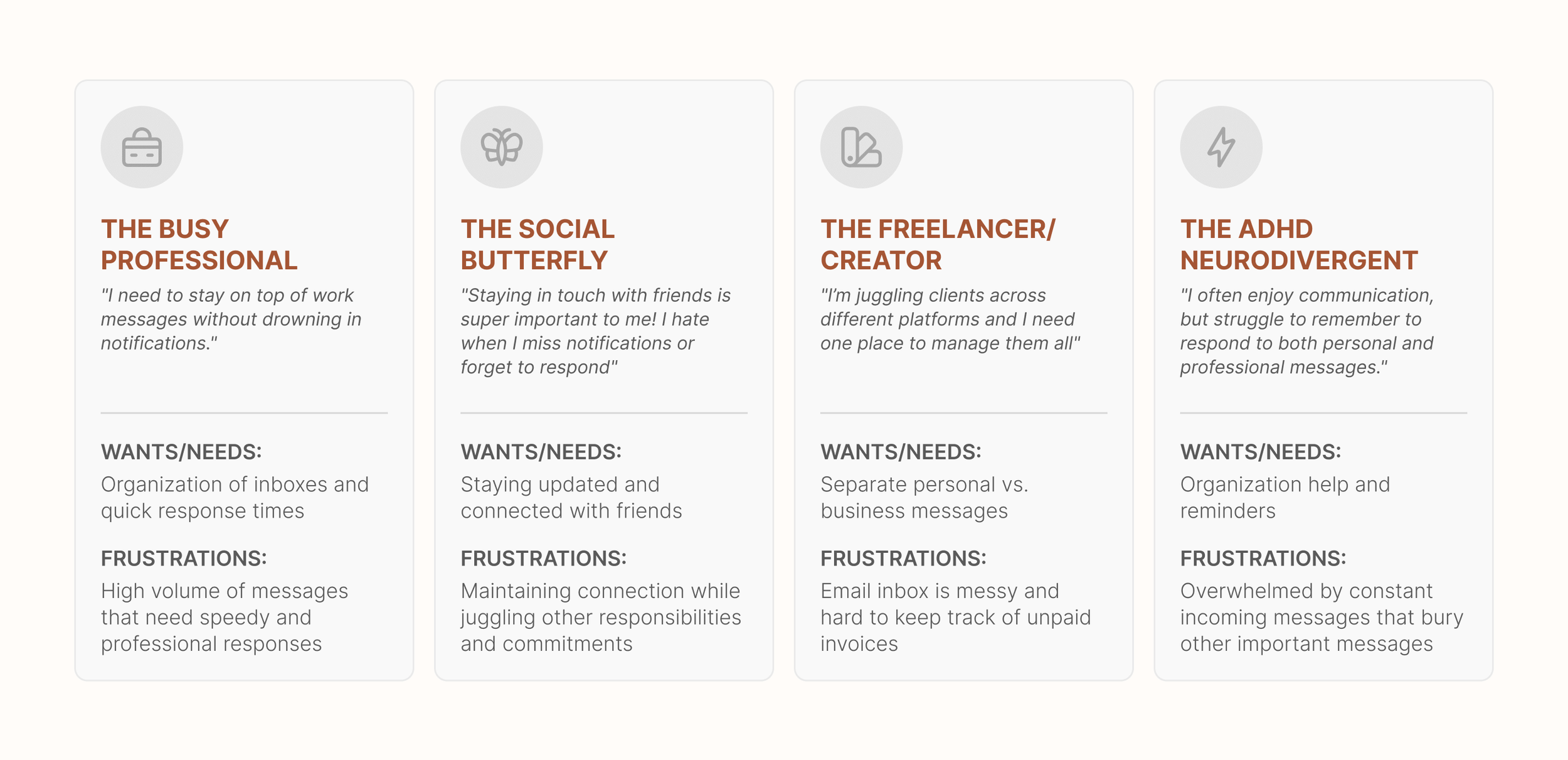 This assignment brief was left intentionally open-ended, leaving us to explore a variety of avenues for problems we wanted to target and solutions we wanted to create. Drawing from our own experiences of message and notification overload, we found that billions of people worldwide utilize various messaging applications, receiving hundreds of notifications per day across platforms. This often causes important messages to be buried or forgotten.