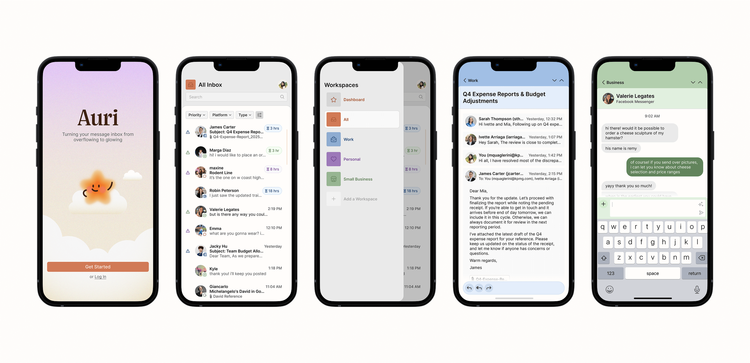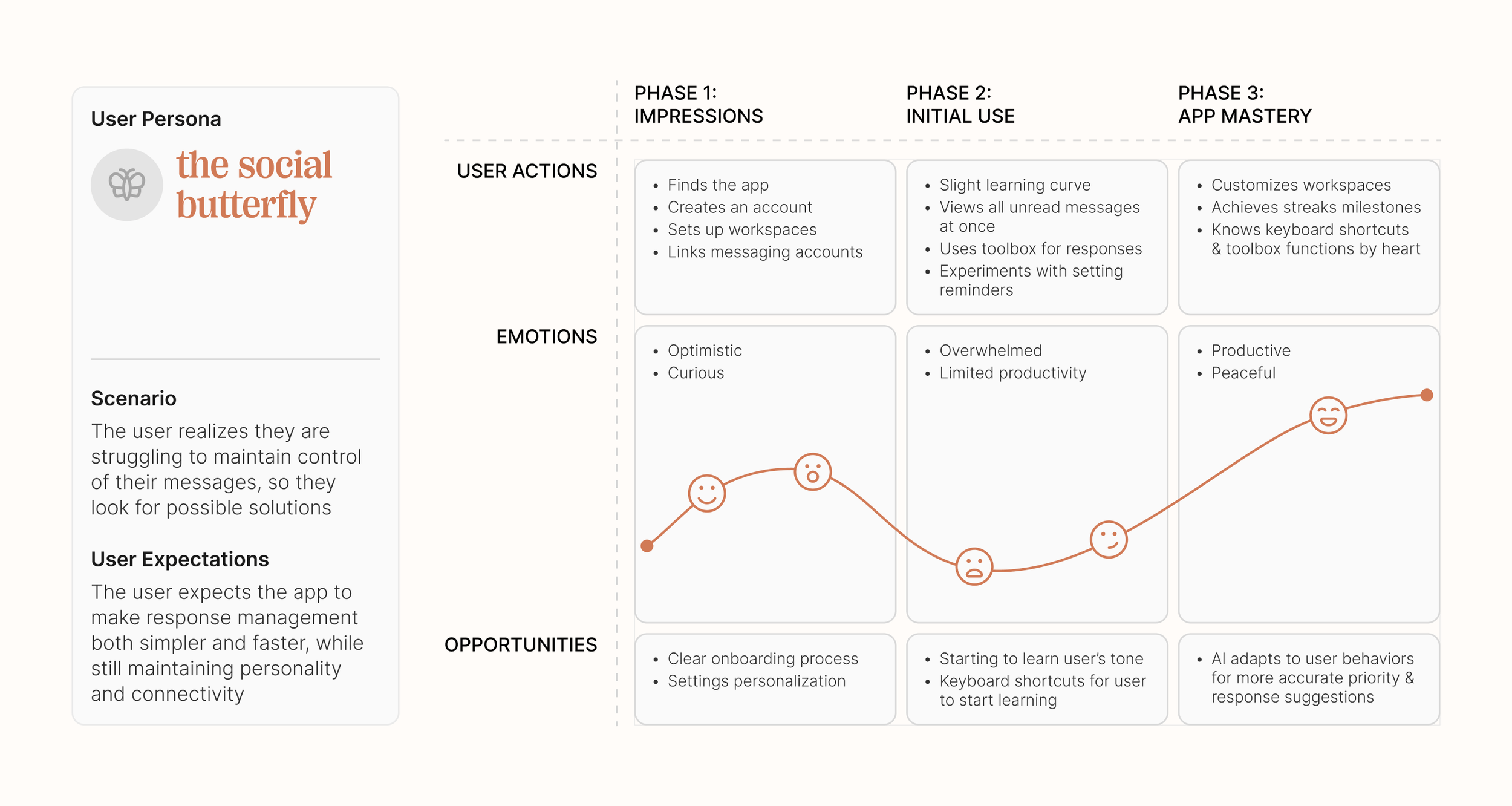 Auri was the cherry on top of all the research we conducted and systems we developed. Gamification of reply streaks separates the application from competitors and encourages users to stay on top of incoming messages. Complete with in-app reminders and responsive facial expressions, Auri is designed to happily support even the most stressed users