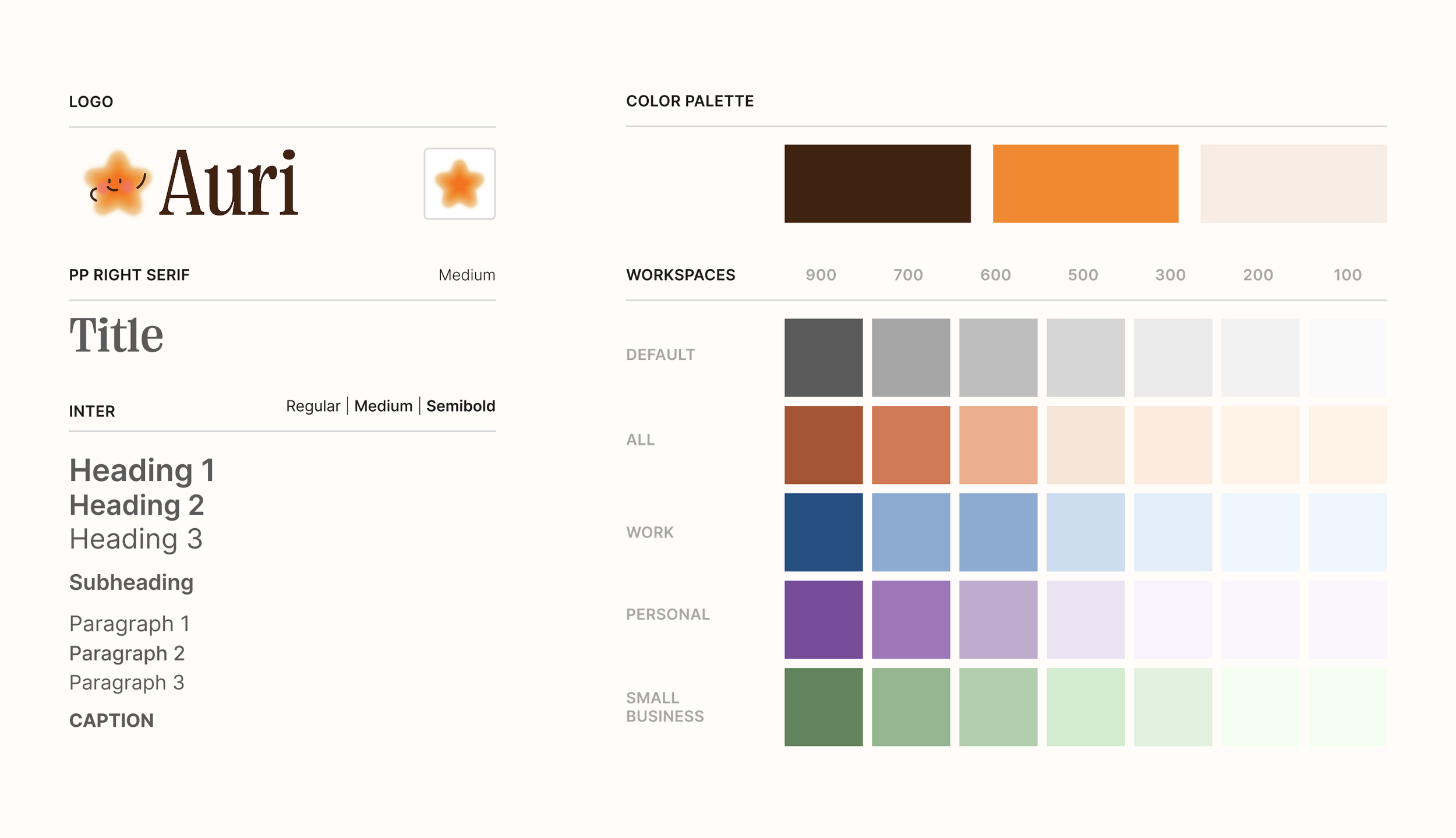 Typography and color systems (note that workspace color systems would be more extensive than the five included, as further color options are customizable for each user workspace)