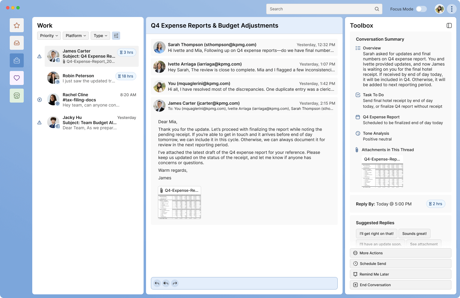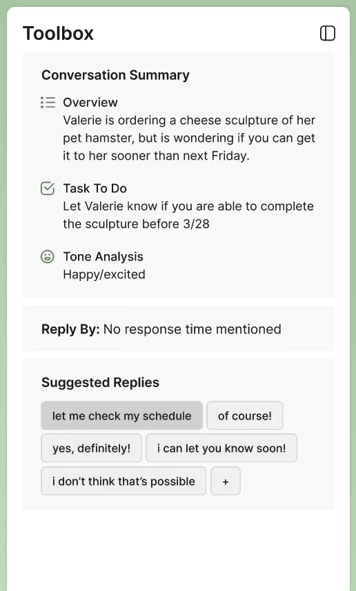Small business workspace, displaying the suggested replies and schedule send features of the toolbox