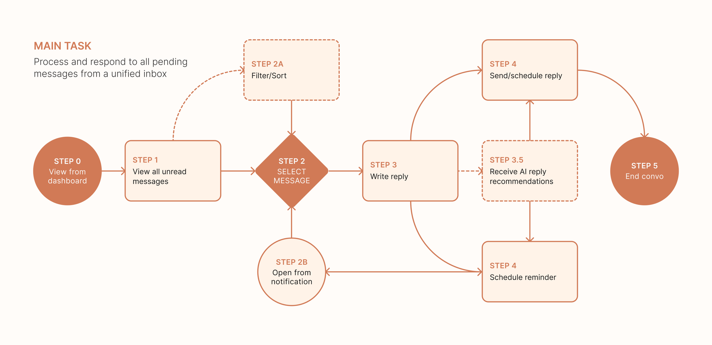 Several optional steps within the flow were added in order to support the user, guide them through the messaging process, and gives them flexibility to reverse mistakes