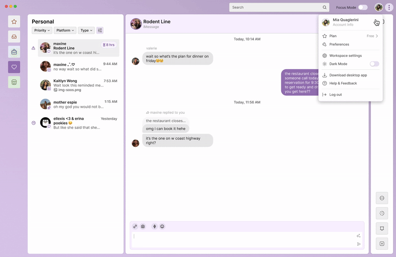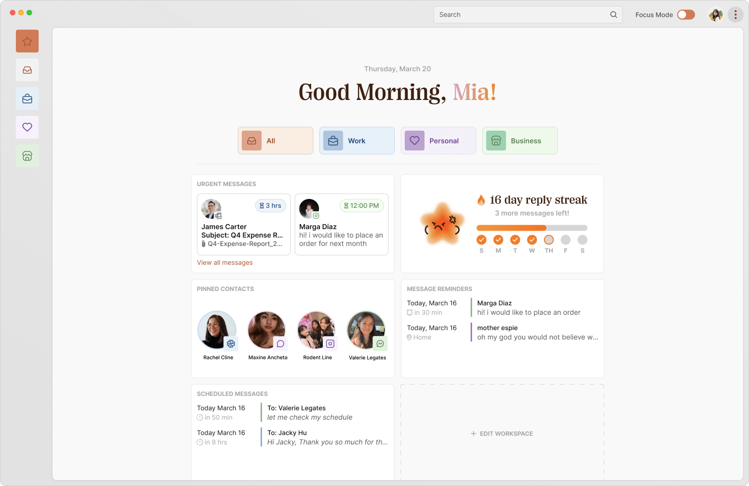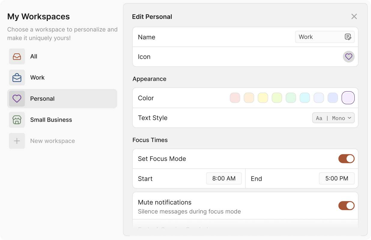 Set focus times for each workspace, muting messages from other workspaces and allowing the user to focus on the task at hand
